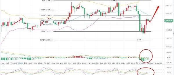 1900/1/1 0:00:00比特幣周末兩天連續沖高,價格一路突破24000,早上觸及24288一線后又迅速下跌,但是又立馬反彈上來,說明多頭處于強勢.