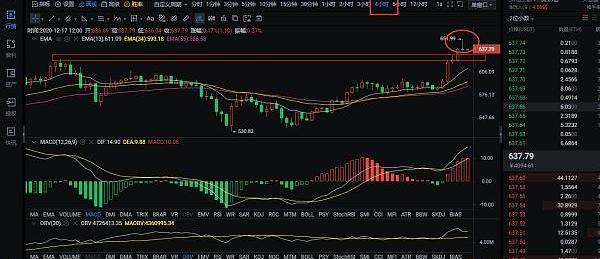 從日線來看,輝神在上一次視頻講解中說過,幣價要是沖高600上方,那么MACD指標就會出現拐頭向上形成金叉。目前實際也是形成了金叉拐頭。后市我們還是看多頭上漲方向即可!