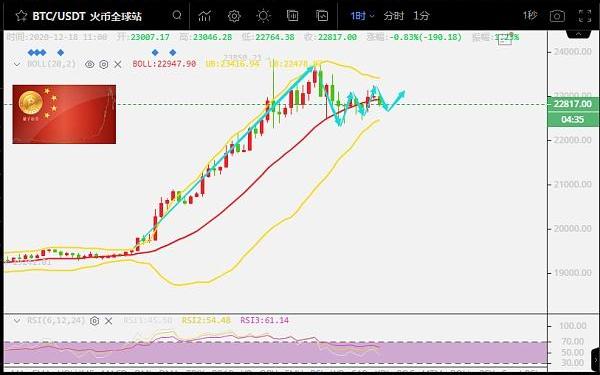 BTC行情分析:暴風驟雨之后會迎來一段時間的平靜,前兩天比特幣暴漲暴跌,以暴漲為主,在進行一段時間的日線級別的區間調整的能量聚集后爆發將價格推到23000以上。現在這一波能量已經釋放,開始新一輪的區間調整聚集新能量,現在已經形成以23000點為中心的1小時級別的區間調整。