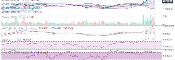 日線圖中,比特幣接連三日K線收陽,昨日一根大陽K線突破布林帶的上軌到其區域外運行,最高向上觸碰到23850點位;這波拉升,漲幅高達近13%,行情最大波動幅度3300多點;今日行情有所下滑,有回落布林帶區域內的趨勢;行情的逐漸沖高,讓市場產生緊張的情緒,害怕盈利回吐或是高位崩盤,觀望或是套現的現象出現,導致行情出現了回調。