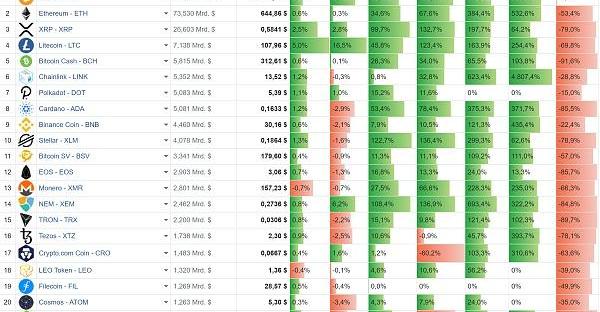 現在就是比特幣的高光時刻,突破2萬刀后眨眼已經沖高23800了,盤面上只有ETH和LTC能勉強跟住大餅的腳步,原來幾個知名的主流幣,BCH,BSV,EOS簡直弱不禁風,山寨幣很多還是在跌。