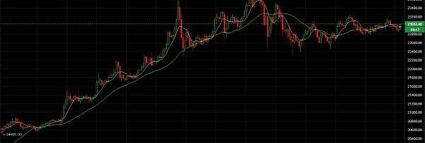 比特幣沖到23850美金后,部分底部入場的資金選擇獲利了結,隨之價格迎來一波小幅回調,這在OBV和盤口中可以很清晰的觀察到,市場資金不止一波,目前資金再度回流,價格也會有所反映;日線上看,行情還會繼續上行,目標在25000美金附近,現貨持有即可。