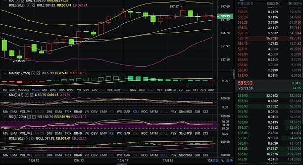 1900/1/1 0:00:00行情觀點: 以太坊昨日在597附近遇壓回調,大幅回踩至579.3一線反彈走震蕩,今日凌晨4時重回590上方,小時級別來看,以太在593一線遇壓回調震蕩下行,觸底582.5一線反彈,收十字陰K.