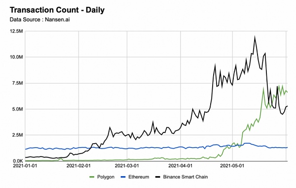 Polygon (綠色) vs 幣安智能鏈 (黑色) vs 以太坊 (藍色) 上的交易。Cr: Our Network