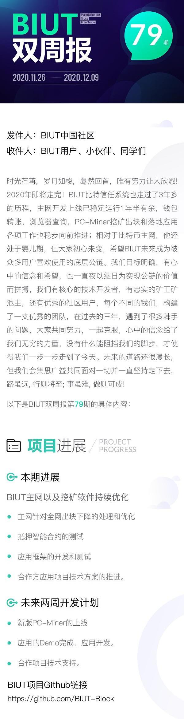 XRP/HKD-1.81%時光荏苒,歲月如梭,驀然回首,唯有努力讓人欣慰!2020年即將走完!BIUT比特信任系統也走過了3年多的歷程,主網開發上線已穩定運行1年半有余,錢包轉賬,瀏覽器查詢,PC-miner挖礦出塊和落地應用各項工作也穩步向前推進;相對于比特幣主網,他還處于嬰兒期,但大家初心未變,希望BIUT未來成為被眾多用戶喜歡使用的底層公鏈。我們目標明確,有心中的信念和希望,也一直夜以繼日為實現公鏈的價值而拼搏,我們有核心的技術開發者,有忠實的礦工礦池主,還有優秀的社區用戶,每個不同的我們,構建了一支優秀的團隊,在過去的三年,遇到了很多棘手的問題,大家共同努力,一起克服,心中的信念給了我們無窮的力量,沒有什么能阻擋我們的腳步,才使得我們一步一步走到了今天。未來的道路還能漫長,但我們會集思廣益共同面對一切并一直堅持走下去,路雖遠,行則將至;事雖難,做則必成!比特幣主網是這樣走過來的,以太坊的創始人V神前一段還分享過,最初他也被比特幣社區的人員瞧不起,現在V神確似神一樣的存在。一步一步,使命必達。???
