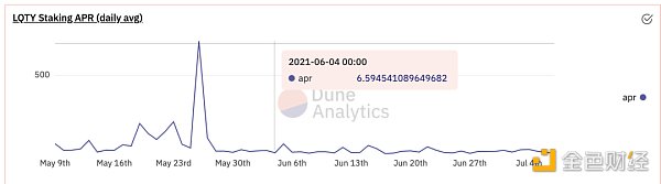 4. 在LUSD系統逐步穩定的6月份,LQTY所能捕獲的價值并不多,而隨著供應量的不斷提升,LQTY的質押收益降低顯著,我們按日計算當天LQTY的總收益,并按照LQTY價格和質押量折算出按照當日收益的APR,得到下圖——