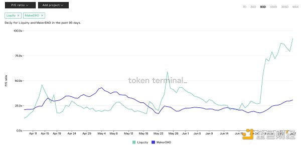 由于Maker的全部協議收入也都由MKR獲取,所以這Maker的P/E和P/S也是相同的。所以我們直接來比較MKR和LQTY的 P/E——
