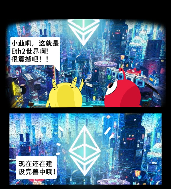 這幅作品從 6 月 28 日晚上開始構思,29 日畫完草稿,一直到 7 月 1 日凌晨,畫了 3-4 天終于畫好了。漫畫中簡單表達了對 Eth2 的美好愿景,也有一些小槽點,希望大家喜歡。
