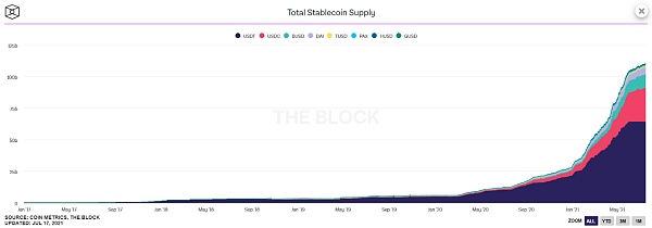 7月17日,The Block數據顯示,穩定幣的總供應量已超過1100億美元大關。其中,USDT以58.73%的市場份額占比排名首位,USDC占比23.34%,BUSD占比10.29%,DAI占比5.01%。