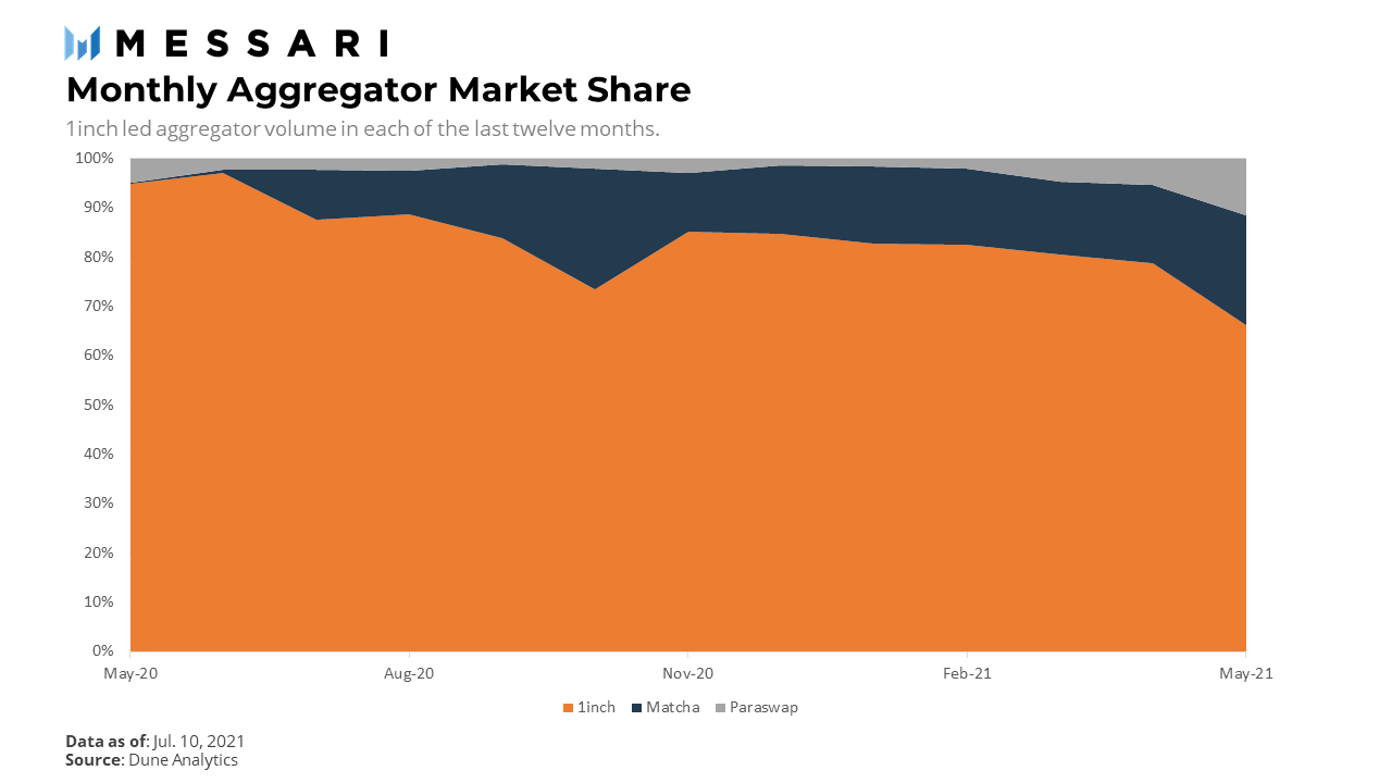 作為聚合器,Matcha 獲得了市場份額,但在去年全年都落后于 1inch協議。在以太坊上,1 inch在總交易量中占主導地位。自 2020 年 5 月以來,1inch 平均獲得了所有以太坊 DEX 交易量的 10%。這個聚合器領導者為 DeFi 用戶提供了垂直整合的一站式交易界面。 1inch 的使命是通過以最低成本提供最簡單的執行來掩蓋交易來源。 1inch通過專注于DEX聚合有效地確保了其市場領先地位。