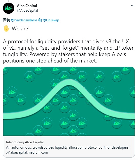 Ribbon Finance 的社區經理在推特下方回復,將在 Uniswap V3 上構建一個智能的流動性再平衡管理器,用 Simplicity 區塊鏈智能合約編程語言。