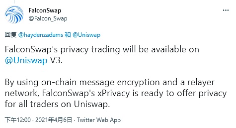 FalconSwap 是基于 Uniswap 構建的第二層擴展解決方案,可以進一步擴展,以聚合其他 DeFi 平臺,如 Mooniswap、Kyber、Balancer、Airswap、Bancor 等。FalconSwap 稱隱私交易將在 Uniswap ?V3 通過使用鏈上消息加密和中繼器網絡,xPrivacy 已準備好為 Uniswap 上的所有交易者提供隱私。