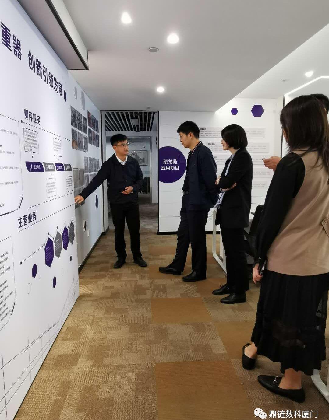 工信部人才交流中心領軍人才工作辦公室主任白曉、副主任陸書濤、張真及隨行人員首先參觀了公司辦公區、展覽區,聽取了蘇建財總經理對可信區塊鏈場景應用、密碼測評服務、網絡安全和數據治理等產品、服務的詳細介紹。蘇建財表示,鼎鏈數字科技有限公司作為扎根廈門的科技企業,借助鼎鏈數科強大的技術背書及行業沉淀,致力于從技術研發、技術服務、整體解決方案支撐等多方面推動區域可信區塊鏈行業以及密碼產業發展和業務落地,為智慧城市、政務、教育、醫療、金融等領域,提供區塊鏈平臺及深度應用解決方案,并且在國密改造、商業密碼應用安全性評估等提供全面的本土化服務。