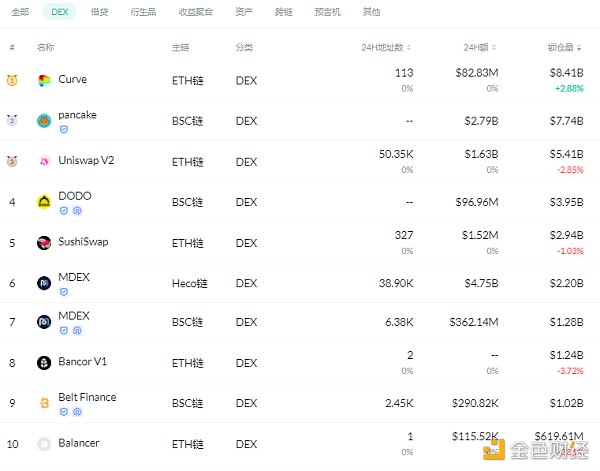 交易量排名前十的DEX 排名來源:DeFibox