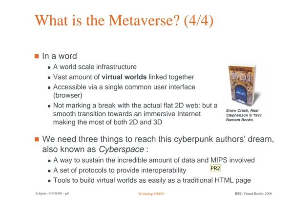 我最終跌跌撞撞地回到原來的帖子,然后發現了一篇題為《Solipsis:虛擬環境的去中心化架構》的演講稿,它是由一組研究人員在 2008 年編寫的(由元宇宙先驅 Will Burns 起草),這篇演講稿提供了最有見地的元宇宙框架,即元宇宙根本上是由內容、元世界以及元星系(metagalaxie)組成。