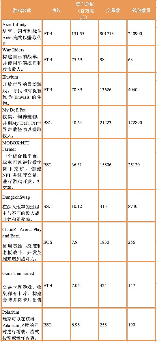 “玩賺”模式代表了GameFi時代的來臨,這個階段的鏈游引入了DeFi協議,通過DeFi+NFT的模式,推動游戲資產的交易。除了Axie Infinity之外,Alien Worlds、Cryptoblades、Sorare、Zed Run也是GameFi下的產品。