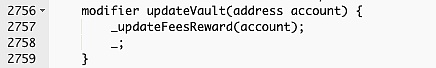 隨后攻擊者調用 Sorbetto Fragola 合約的 deposit 函數存入提供流動性對應的兩種代幣 (這里以攻擊者首次存入的 WETH 與 USDT 代幣為例),其會先通過 checkDeviation 與 updateVault 修飾器分別檢查價格與更新獎勵。價格檢查主要是針對價格是否出現大波動被操控等情況,這里不做展開。而獎勵更新就與本次攻擊密切相關了,我們切入分析:
