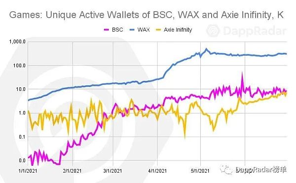 3月底,區塊鏈生態系統中與游戲相關的智能合約連接的每日活躍錢包數超過5.1萬個。在第二季度,所有區塊鏈的每日活躍錢包數量飆升至359,284個,增加了599%。需要注意的是,我們談論的是與區塊鏈上的智能合約交互的錢包。根據游戲的不同,這將需要在每個游戲回合中進行多次交互,或者只需一次交互即可獲得獎勵。