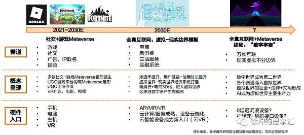 關于元宇宙何時會迎來爆發,天風證券研究認為,“硬件革命推動內容形式重構,VR最可能成為Metaverse虛擬世界入口”。同時,天風證券也對元宇宙的發展階段進行了預測分析: