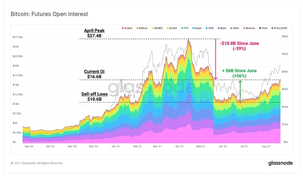 先看衍生品市場的變化。比特幣期貨的未平倉頭寸與幣價齊升。5月份,未平倉頭寸從274億美元急劇下跌至106億美元,目前已經反彈到166億美元。本周,隨著交易者開始使用更多杠桿,期貨合約的開倉量增加了10億美元。