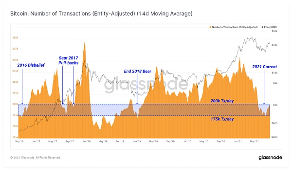 實體調整后的交易數仍保持在每天17.5萬到20萬筆的歷史低位。鏈上活動仍然沒有對積極的價格走勢做出反應,說明市場存在較大分歧。