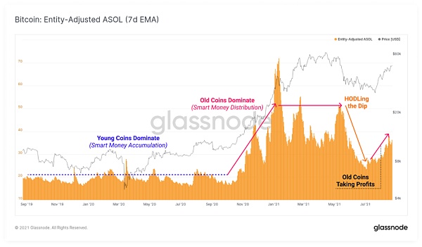 ASOL指籌碼在花費輸出發生時的平均壽命。自7月以來,ASOL一直在上升并貫穿本次反彈,可以解讀為以下兩種情形: