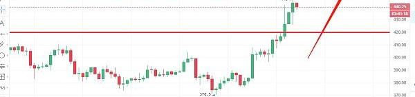 策略一:企穩440一線多單入場,目標450-460,止損4個點