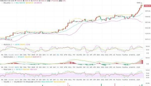 昨日老顧預測日內比特會攻上15200一線,截止晚間12點,比特最高漲至15150,可以說到達預期點位。今日開盤比特再次上行,到目前為止最高運行至15985一線,現幣價運行于15500附近。