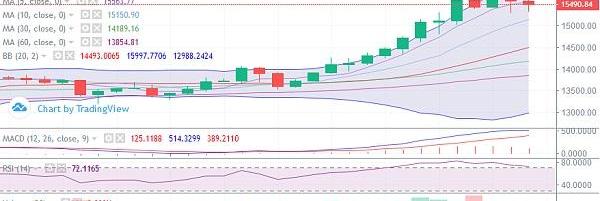 比特幣今天早間最高試探到了15985的位置,上方壓力位還是比較強勁,試探一下就回落下來。從日線來看,K線小幅收陰,MACD紅色動能明顯有點量能不足的跡象,說明在上方的位置拋售了很多買單,價格短期內難以有再進一步上升。KDJ和RSI指標都是向下聚合發散,這輪上漲之后接下來應該會小幅度的回調一波,蓄力然后在向壓力位置發起沖刺。關注上方15800的壓力位置,下方15000的支撐位置,晚間操作思路麗姐還是建議反彈做空為主。