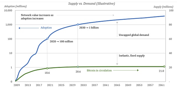 Unchaincapital業務負責人Parker Lewis發表的文章預測,2020年比特幣的總用戶將達到1億,到2030年比特幣的總用戶將達到10億。2020年,平均每個持幣者持有0.2個比特幣,2030年每個持幣者將僅持有0.02個比特幣。