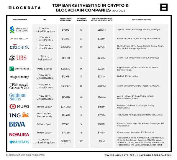XRP/HKD+2.98%區塊鏈市場情報機構Blockdata在上周的一份最新報告中公列出了迄今為止對加密貨幣和區塊鏈公司投資最多的13家銀行/投行。全球銀行業巨頭紛紛下場,對新興的加密和區塊鏈公司產生了濃厚的興趣。根據Blockdata研究,世界前100家銀行中有55%投資于加密和區塊鏈領域。