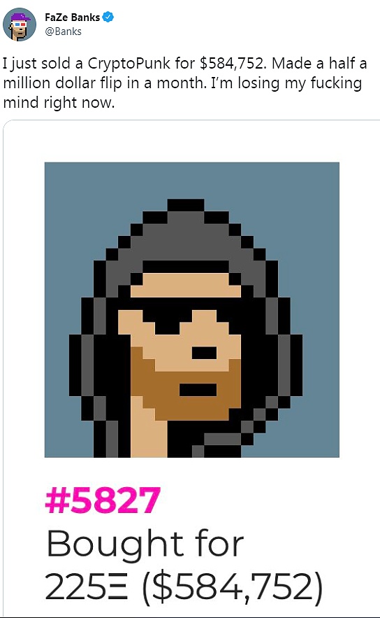 炒作人士也已在這波NFT熱潮中獲利。一名推特網友日前發文稱,自己剛以58萬美元的價格出售了一枚CryptoPunk,“相當于一個月賺了50萬美元,我簡直要瘋了”。