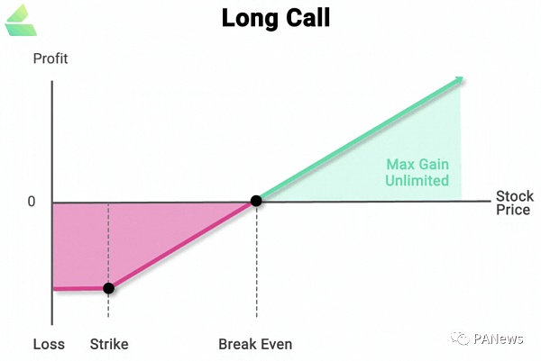 以下圖所示,以購買看漲期權Call為例,在達到行權價Strike之前,損失為固定的100%,即購買期權的全部本金。當達到Break Even時,收入剛好覆蓋購買期權的成本,總收益為零。倘若價格繼續上漲,收益將急劇增加。如果將現貨或低倍杠桿的期貨與期權放在同一坐標系中,期權對應的圖形斜率更大,可以理解為期權的杠桿倍數更高。