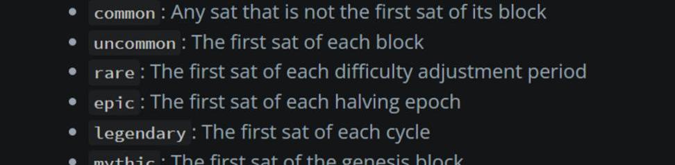 鑒于銘文是使用序數理論刻在單個聰上的,于是每個聰又按編號被劃為了不同的珍惜檔次。BRC-20的另一個熱點就是尋找那些稀有的聰,對收藏家非常有吸引力,例如那些收集編號小于100k的銘文或區塊減半后的第一個銘文等。