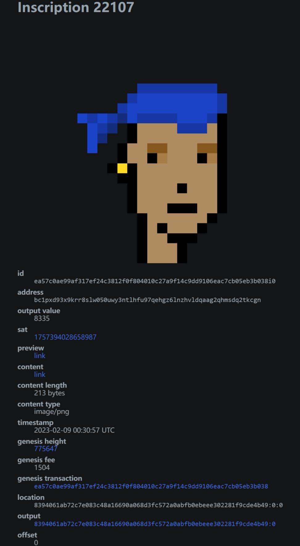 以BTC上的CryptoPunk為例,每個NFT的聰、區塊、銘文等信息可以通過ordinals查看,如下圖所示: