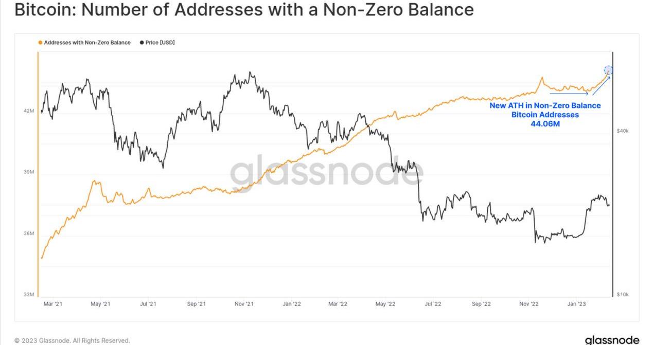 與此同時,非零余額地址總數已達到4406萬的歷史新高。總的來說,這表明最近比特幣網絡的活動出現了短期上升,但這不一定是指交易的比特幣數量。此活動的主要來源是由于Ordinals,它沒有承載大量的比特幣,而是承載了更大的數據和新的活躍用戶。