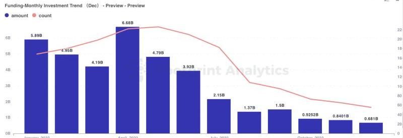 2022年整個Web3的融資金額整體呈下降趨勢,從1月的58.9億到12月的6.71億。