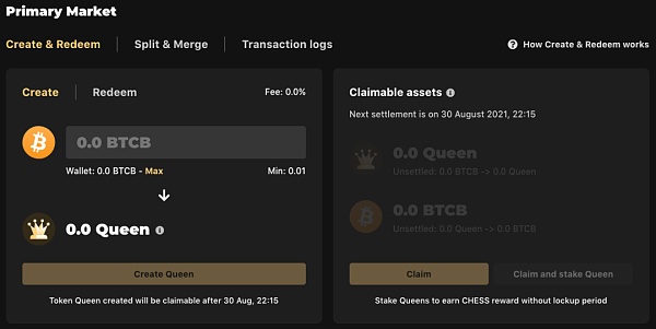 Primary Market為用戶提供存入BTCB(最小0.01BTCB)鑄成Queen及將Queen贖回成BTCB的服務。