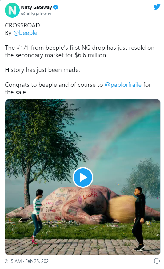 CROSSROAD是Beeple另一幅作品。它的特點是反特朗普的創作內容,一個巨型的特朗普正躺在一片垃圾堆里,身上寫滿了臟話和涂鴉。不過,該作品還有一個特點,就是它會隨著選舉結果的發生而展現另一幅畫面。如果特朗普贏了,該畫作就會變成他戴著王冠,在火焰中大步走過。該作品在Nifty Gateway市場完成了交易,交易者是NFT的原主人(Twitter用戶Pablorfraile)和一個匿名買家。有趣的是,Pablorfraile 是在四個月前買下了這個NFT,而這個售價是其原價的10倍。