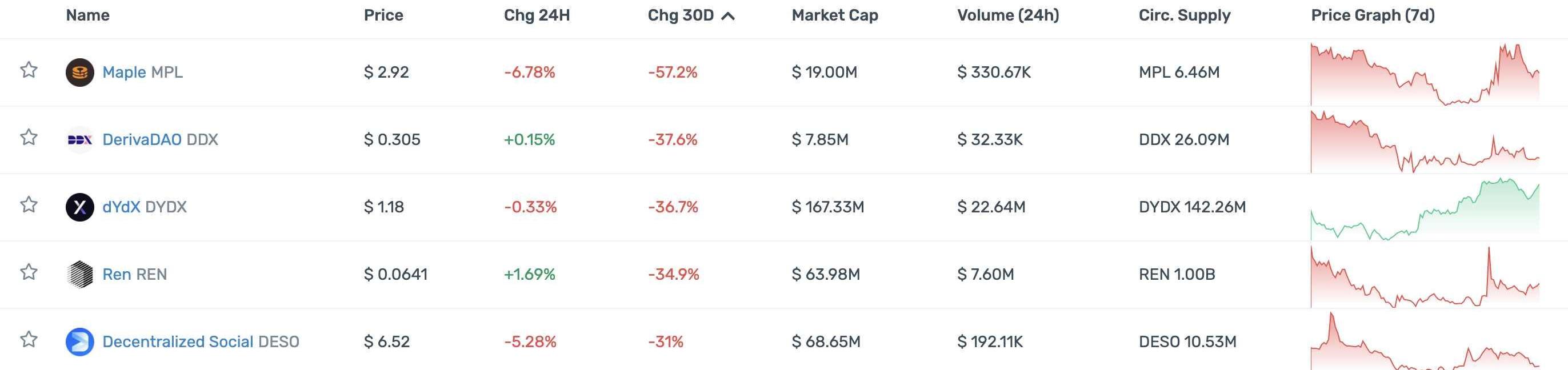 4、在過去一個月,很多此前被大肆炒作的去中心化社交項目的表現十分糟糕,目前該領域也沒有一個具有統治力的項目,觀察接下來Nostr以及Farcaster的發展會非常有意思。