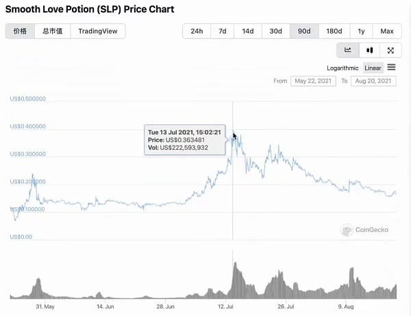 這里還涉及一個Axie Infinity的代幣經濟問題。5-7月是這一游戲的高速發展期,大量新增用戶和資本涌入Axie Infinity,這時SLP和AXS迎來雙漲,SLP在7月一個月內增發了十倍。這個階段很多人預測SLP可能要下跌,但實際上,這個階段SLP也在緩慢增長,而代幣超發導致通貨膨脹量也在增長。這時有些玩家可能會因為回本周期太長,把SLP換成以太坊或是美元,這將導致SLP的價格大幅下跌,同時又伴隨著通貨膨脹。從7月到8月,SLP的超發已經超過10倍,面臨崩盤風險,這對玩家和資本方也不友好。所以,8月9日,項目方調整了SLP的通脹機制,直接減半。此后,SLP的通脹率便降下來了,同時,代幣消耗機制還在運行。