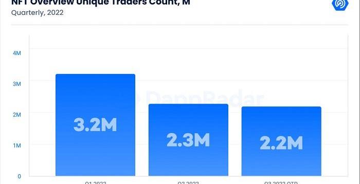 截至2022年第一季度末,NFT總交易額超過120億美元,銷售量達到2800萬筆。然而,進入二季度后,隨著?Terra??生態系統的崩潰和隨之而來的CeFi清算等一系列事件,NFT市場的交易額下降了33%,銷售量下降了29%。二季度經歷的高度經濟不確定性和加密事件導致三季度NFT交易額暴跌,不過市場需求依然保持穩定,即使在NFT交易額急劇下降的情況下,獨立NFT交易者數量仍處于水平面之上,更重要的是,與去年第三季度相比,該指標還增長了36%。