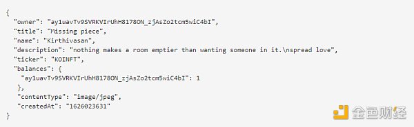 Koii原子NFT對象存儲在SmartWeave合約的狀態中。每個NFT都有一個所有者、標題、藝術家姓名、描述和其他元數據,使周圍的代碼能夠執行其功能: