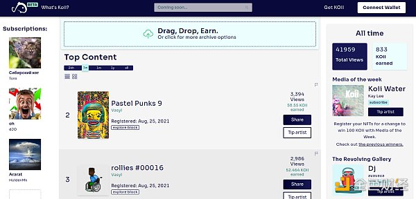 第一個方法是通過koi.rocks,這是一個關注排行榜,每次查看NFT時都可以賺取KOII。