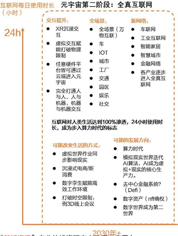 在元宇宙的第二階段,它可能是一個始終在線且實時渲染的3D互聯網(虛擬世界),將現實和虛擬連接在一起。那個時候互聯網將對人類生活達到100%的滲透,而每日使用時長提升至24小時(全時性)。