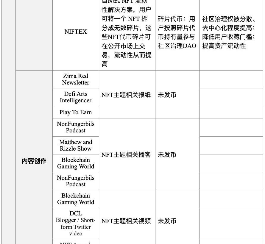 除了前文提到的NFT在加密游戲、加密藝術以及社交代幣中的應用,NFT在其他賽道也有頗多令人興奮的項目,下表梳理了NFT在綜合性交易所,數據庫,去中心化域名,金融以及和DeFi結合的一些代表項目: