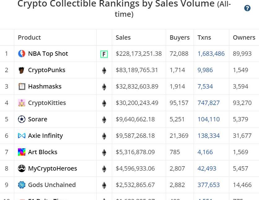 2.1.3.1a總交易額排名第一。NBATopShot集卡游戲公測不到半年后在2021年迅速躥紅,按歷史總成交額計算,NBATopShot的成交額現已達到2億美元以上,排名加密收藏品第一。