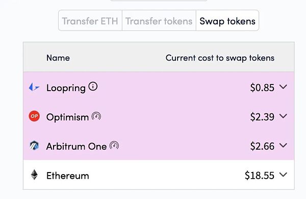1、根據l2fees.info的數據顯示,在轉賬方面(ETH以及token),Arbitrum的手續費要低于Optimism,但要注意的是,在Swap交易方面,Optimism網絡的手續費要低于Arbitrum。