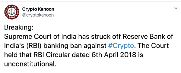 XRP/HKD-4.41%對于印度加密社區來說,這是具有歷史意義的一天,印度最高法院終于對該國中央銀行印度儲備銀行(RBI)的加密貨幣禁令的案件作出了裁決。 該法院裁定,2018年4月6日的印度儲備銀行通函(禁止金融機構向加密貨幣企業提供銀行服務)違反憲法。