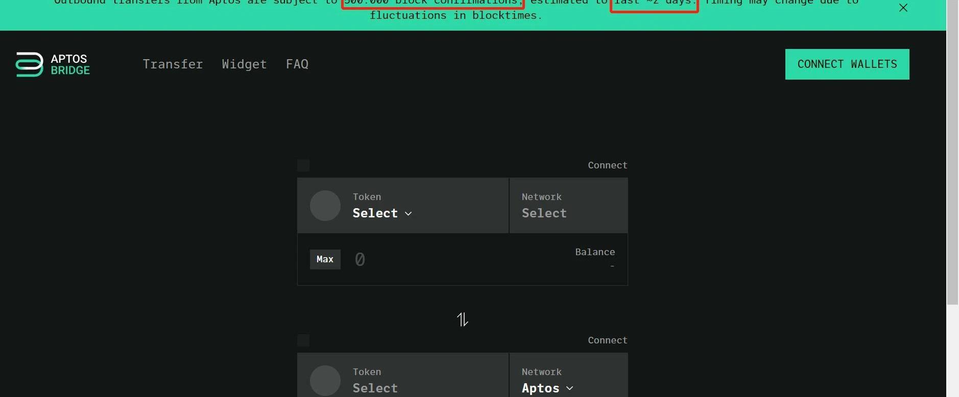 另外,Stargate的收費明細一般不會主動顯示,在早期甚至根本沒有明細,需要用戶點擊金額下面的小三角符號才會看到收費明細,這就會導致很多用戶以為顯示的到賬金額就是最終到賬金額,支付GAS費的時候才發現需要花費巨額費用,以致讓用戶有種被騙的感覺。因此Stargate被用戶稱為隱藏的“跨鏈刺客”。鏈上玩家NANA曾在社群發言稱:“之前用Stargate從Arbitrum上跨鏈ETH到以太坊時,因為收費是ETH沒有察覺,但從Fantom上跨鏈時,GAS費支付token不同,一下付了幾十個FTM,被嚇了了一跳,就再沒用過Stargate了”。除Gas費外,Stargate跨鏈手續費也是一大坑,它雖表示跨鏈手續費是0.06%,但根據不同幣種和不同鏈路收費也不一樣,有的是0.1%,有的可能更高。如果跨鏈資產不同、金額較大會受手續費和滑點影響最終兌換金額還有LayerZero和LiquidswapDEX合作開發的AptosBridge跨鏈橋,資產進入Aptos容易,退出難,用戶充值資產到Aptos只需幾分鐘,但是從Aptos提款至其它鏈至少需要50萬個區塊確認后才能完成,大概需要等待2-3天,在早期甚至需要100萬個區塊確認。而同樣支持Aptos生態跨鏈的Wormhole和Celer退出時間是即時的。盡管官方表示是基于安全性的考慮,但在這個效率為王的年代,時間慢就是最大的致命傷。